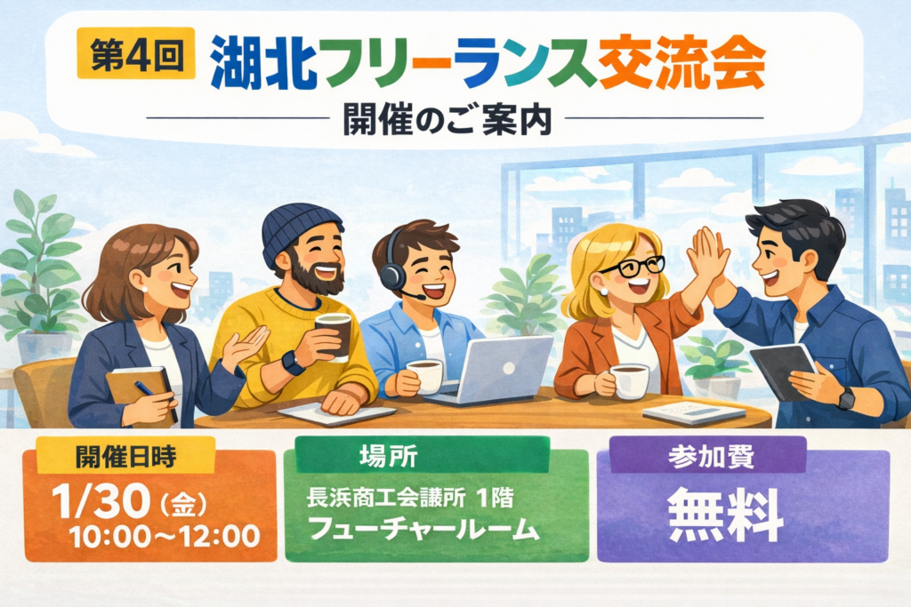 湖北で活動するフリーランス同士が交流を深め、協業パートナーと出会い、新たな気づきを得る場として「湖北フリーランス交流会」を開催いたします。 昨年の振り返りや新年の抱負なども交えながら、フリーランスが湖北で活躍しやすい環境づくりについても一緒に考えていけたら嬉しく思います。お誘い合わせの上、お気軽にご参加ください。